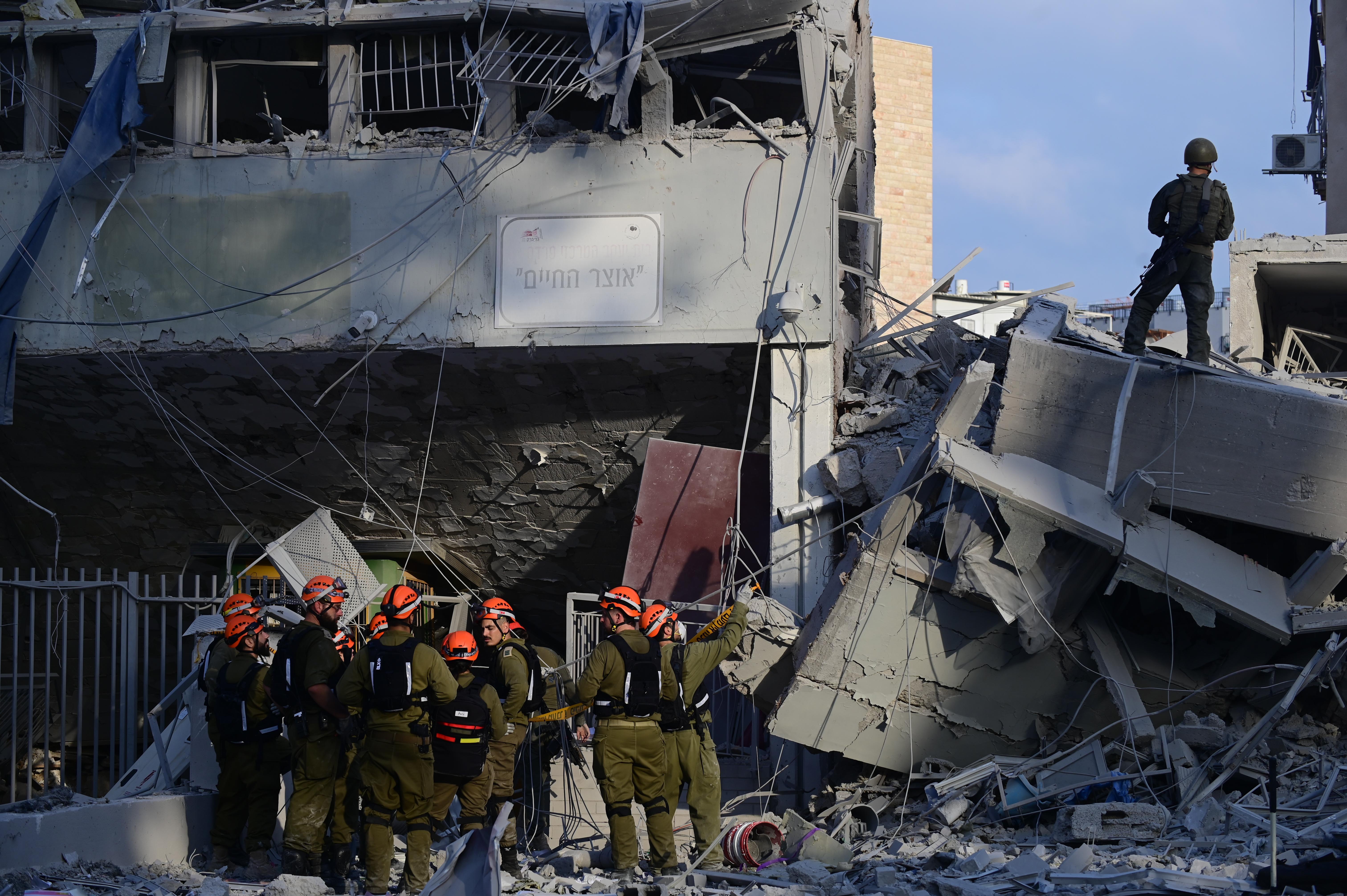 (6月16日,在以色列布内布拉克,应急和救援人员在一处导弹袭击现场开展工作。图片来源:新华社)